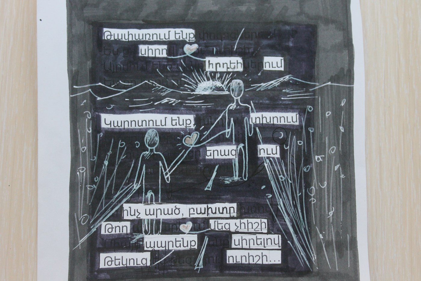 Ստեղծագործելու այս յուրահատուկ եղանակը գրականության ժամին ներկայացվեց Դիլիջանի կենտրոնական դպրոցի յոթերորդ դասարանցիներին և շատ հետաքրքրեց նրանց։ Անմիջապես սկսեցին ստեղծել սեփական բանաստեղծություն-նկարազարդումները, ավելին՝ black out poetry-ին գրավեց նաև վեցերորդ դասարանի երկու աղջիկների՝ Տաթևին ու Անուշին։ Արդյունքում ունեցանք ահա այսպիսի ինքնատիպ աշխատանքներ․